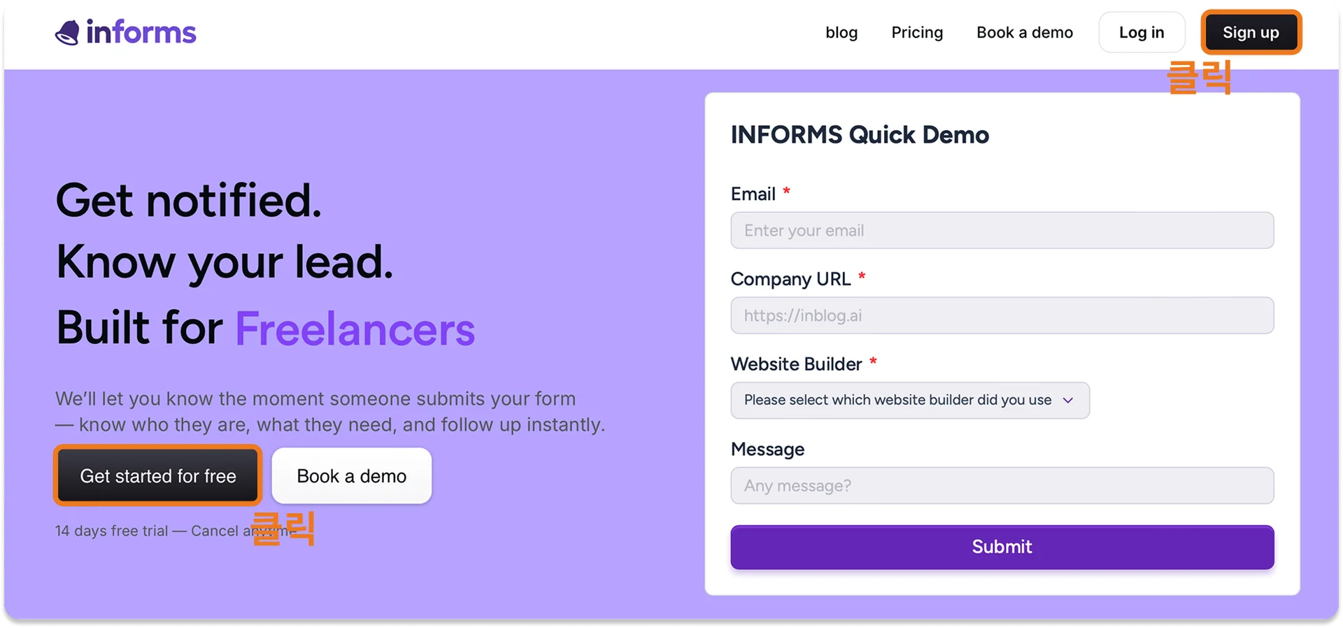 1/ informs.io 에서 Get started for free 혹은 Sign up 버튼을 눌러주세요.