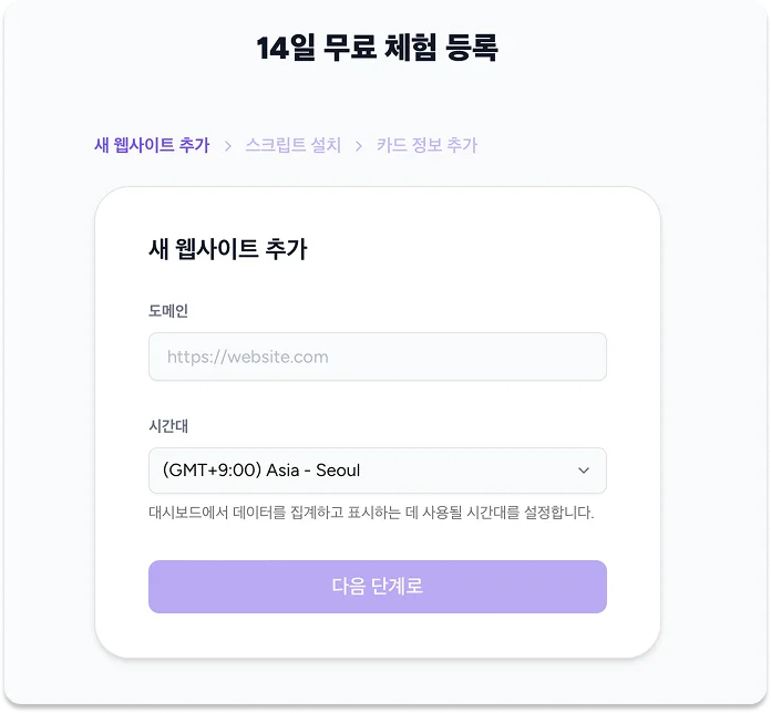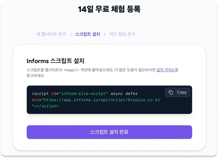 스크립트를 복사하여 웹사이트의 <head> 섹션에 넣어주세요. 스크립트를 추가하는데 어려움이 있다면, 우측 아래 미팅 신청 혹은 채팅봇으로 문의주세요 :)