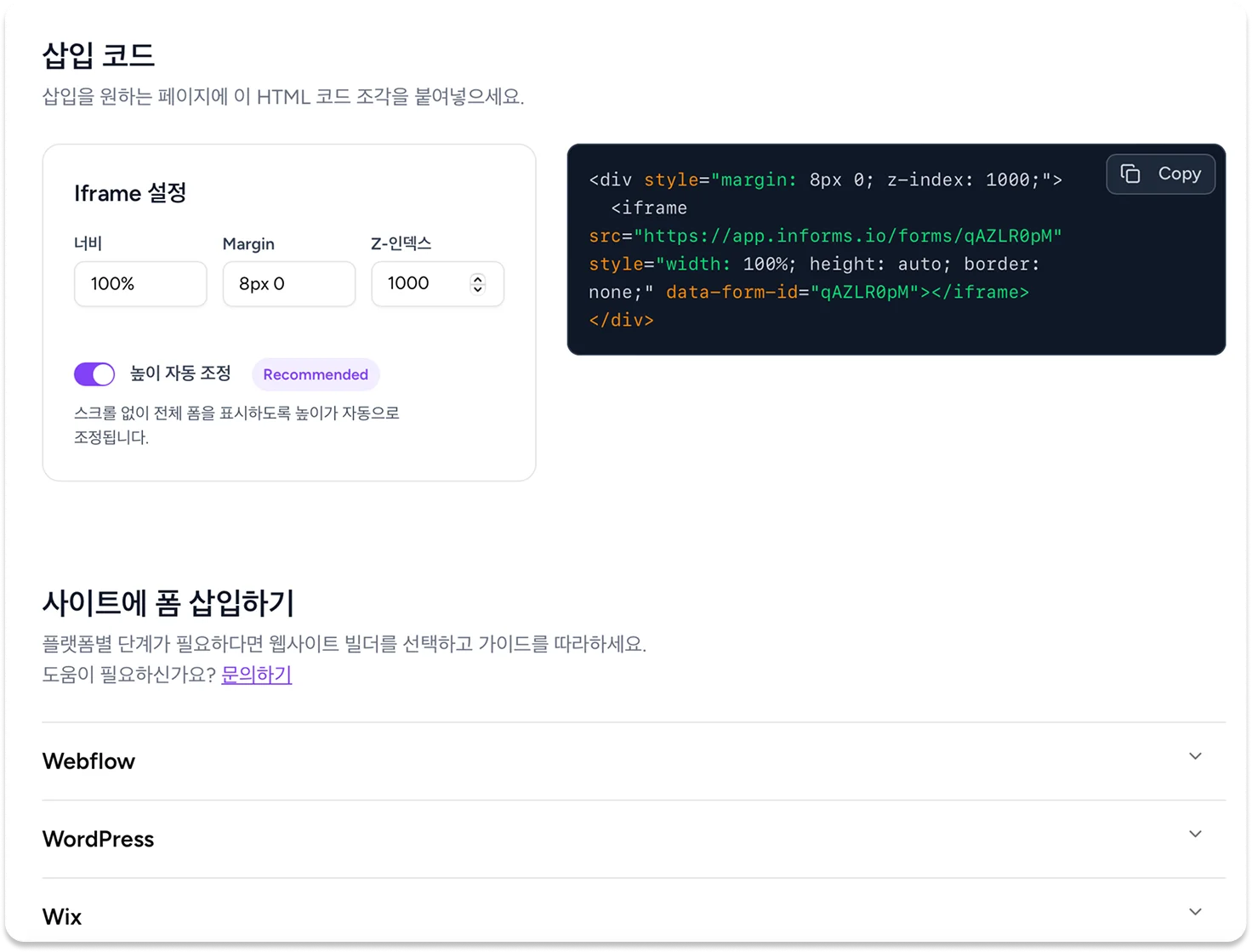 이 때, CORS 정책으로 인해 일부 사이트는 로드되지 않을 수 있으며, HTTPS 사이트만 지원됩니다원하는 위치에 HTML 코드를 넣어 폼을 삽입할 수 있습니다.