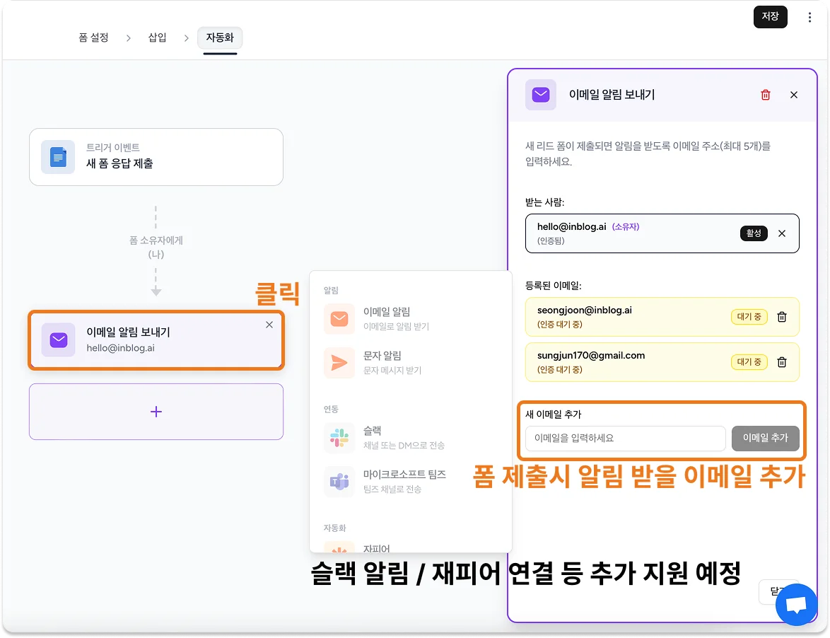 C/ 폼 제출시 알림 받을 방식을 선택할 수 있습니다.
